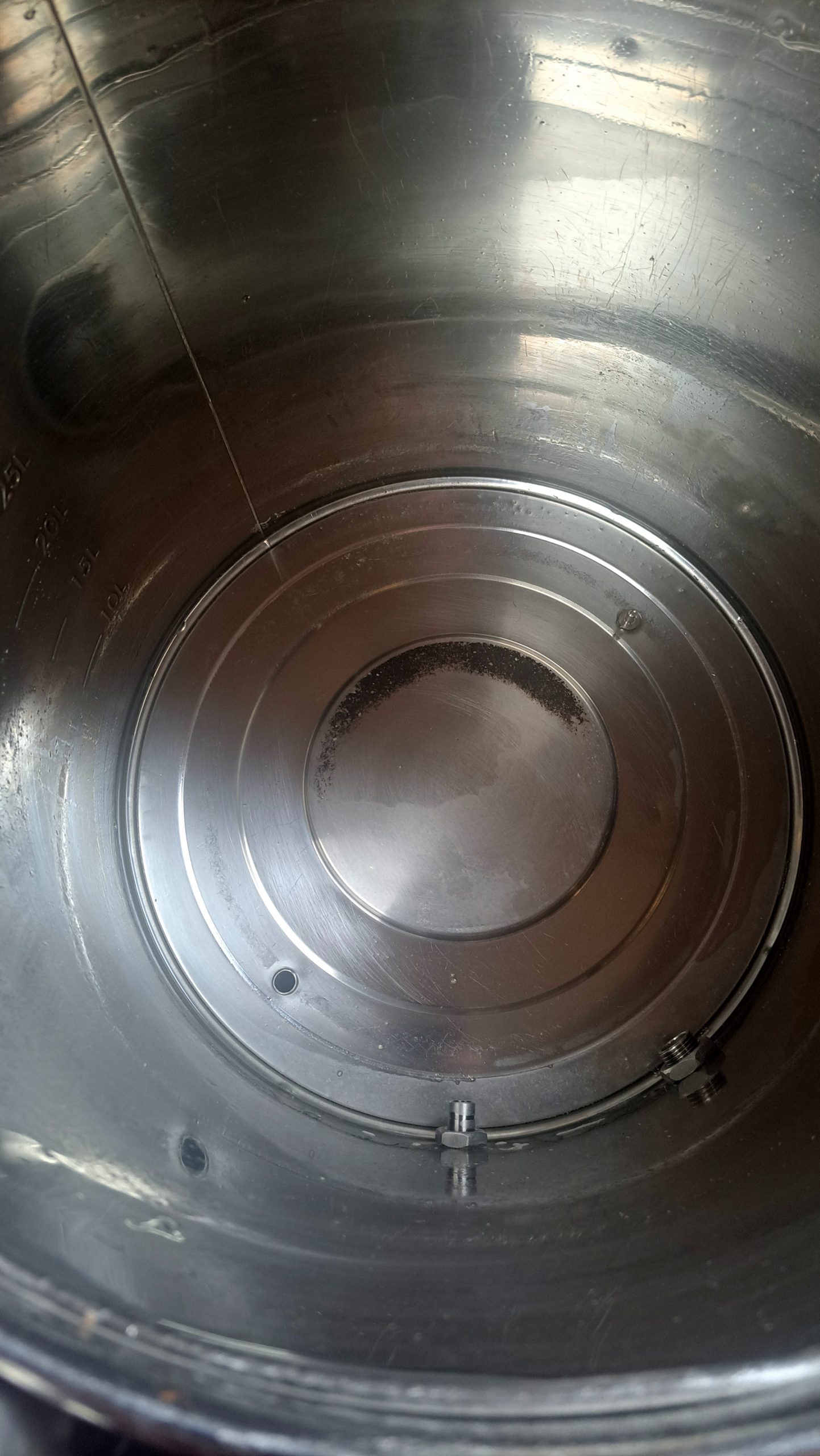 Und zu guter Letzt sehe ich, das trotz vorsichtiger Leitungseinstellung am Boden ein dicker schwarzer Rand aus angesetztem Mehl ist. (siehe Problem mit Malzmühle am Anfang)